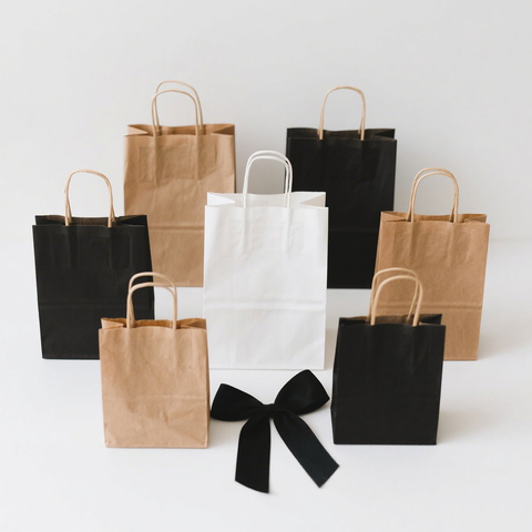 תיק קניות נייר קראפט מותאם אישית שחור לבן חום ממוחזר עם לוגו מותאם אישית עבור העסק שלך